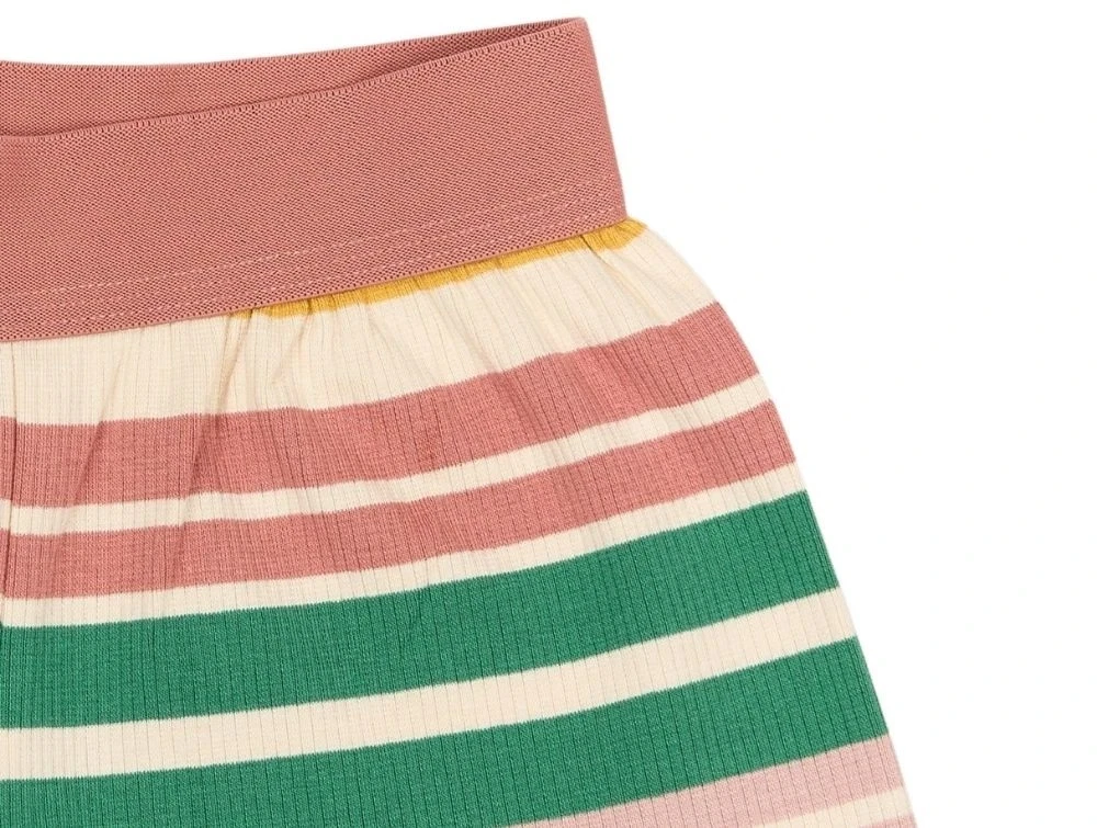 Bløde og strækbare shorts i ribkvalitet med vandrette striber i sommerlige farver og en bred, ensfarvet elastik i taljen. Shortsene har bølget babylock-afslutning i benene og en løs pasform, der giver god bevægelsesfrihed og komfort. De er oplagte til både hverdagsbrug og som en del af et fint sæt med den matchende Ohara top.