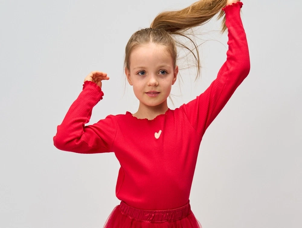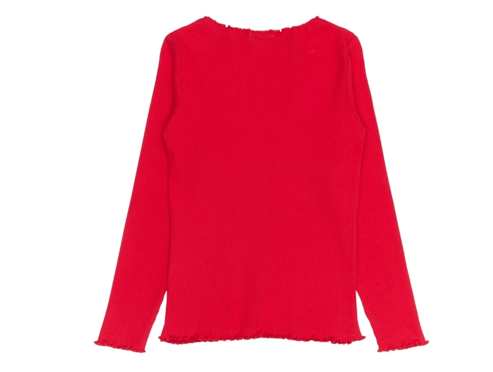 Langærmet rib t-shirt i rød nuance fra THE NEW. Den har et sødt hjerteprint midt på brystet og fine babylock-kanter, som giver et feminint udtryk. En alsidig basis style, der kan bruges til både hverdag og særlige lejligheder. T-shirten er fremstillet i GOTS-certificeret økologisk bomuld med elastan, hvilket gør den blød og strækbar.