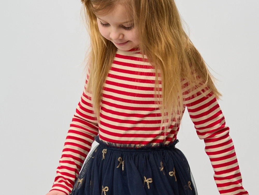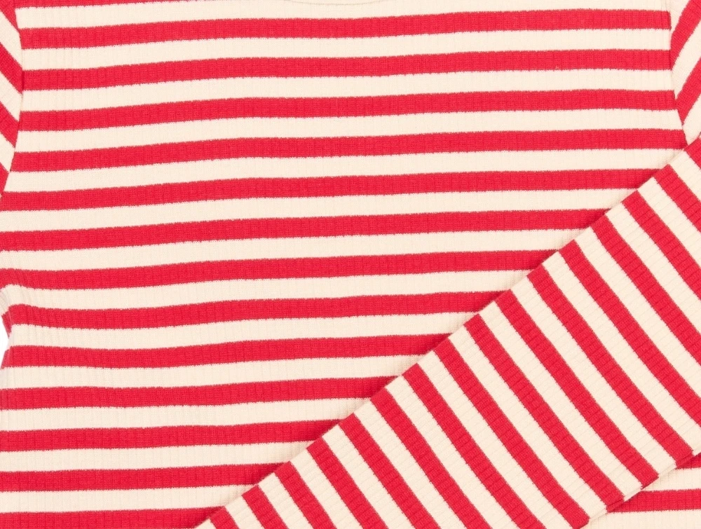 Langærmet rib t-shirt i røde og hvide striber fra THE NEW. En klassisk style med rund halsudskæring og almindelig pasform, der passer til både hverdag og fest. Den ribbede kvalitet gør den behagelig at have på og giver et tidløst udtryk. T-shirten er fremstillet i GOTS-certificeret økologisk bomuld med elastan for ekstra stræk og komfort.