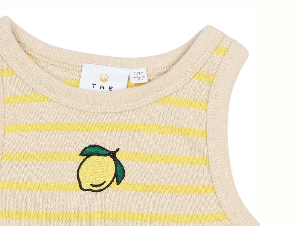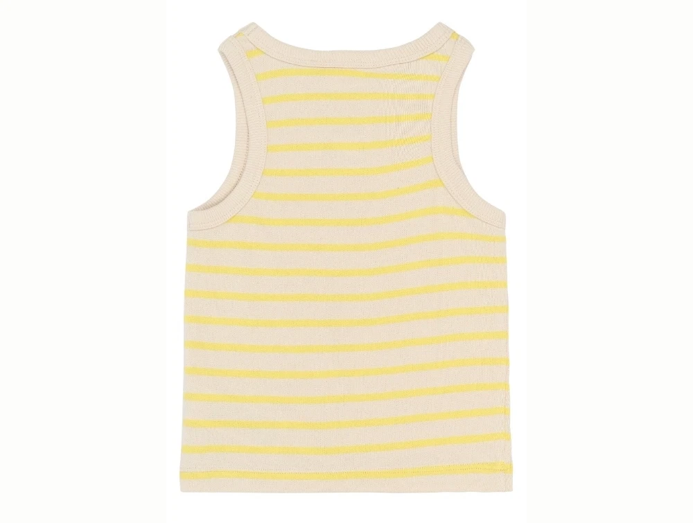 Tanktop fra THE NEW med smalle gule og beige striber (acacia striped) og et lille citronbroderi på brystet.