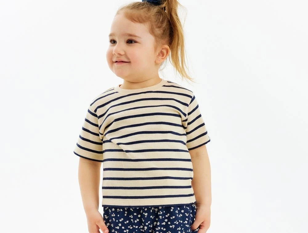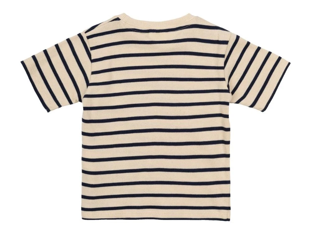 Blød og let t-shirt med et klassisk stribet design i råhvid og mørkeblå. Denne t-shirt er perfekt til både drenge og piger, der ønsker et stilrent og afslappet look.