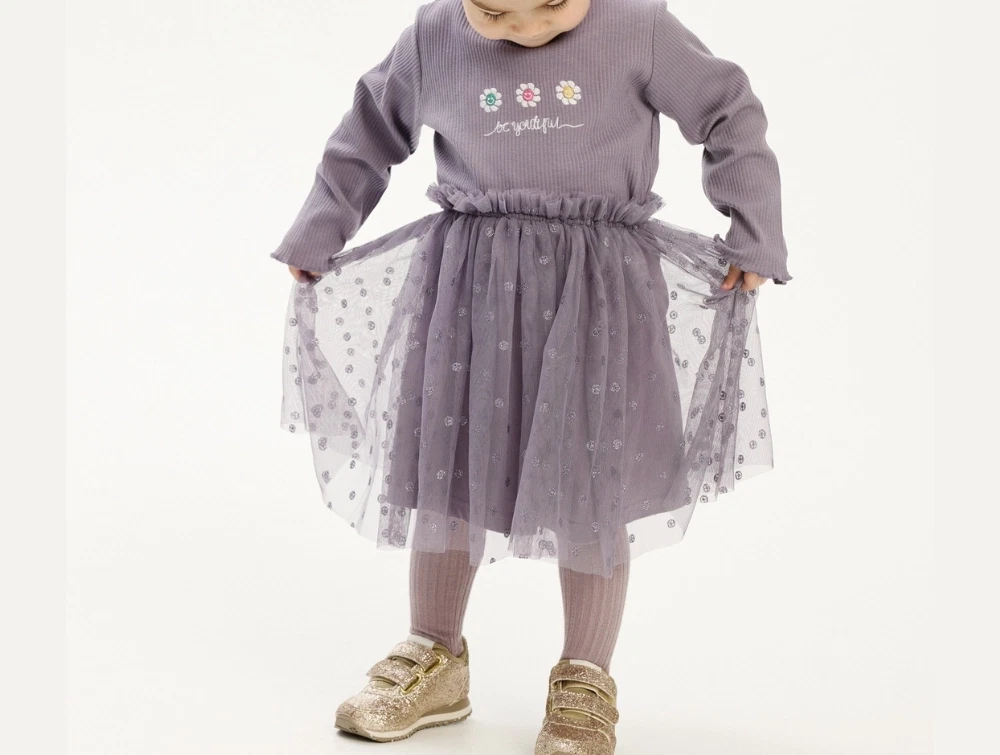 Den har almindelig pasform og elastik i taljen for en behagelig pasform. Indeholder glitter, der kan ændre sig efter vask og brug.