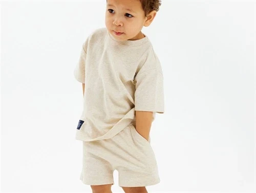 Dreng med beige meleret shorts fra THE NEW Siblings Norval TNST6035THE NEW Siblings sweat shorts i Oatmeal melange med bindebåndTHE NEW Siblings sweat shorts i Oatmeal melange med baglommeDreng med beige meleret shorts fra THE NEW Siblings Norval TNST6035 og grøn T-shirt TNST6027