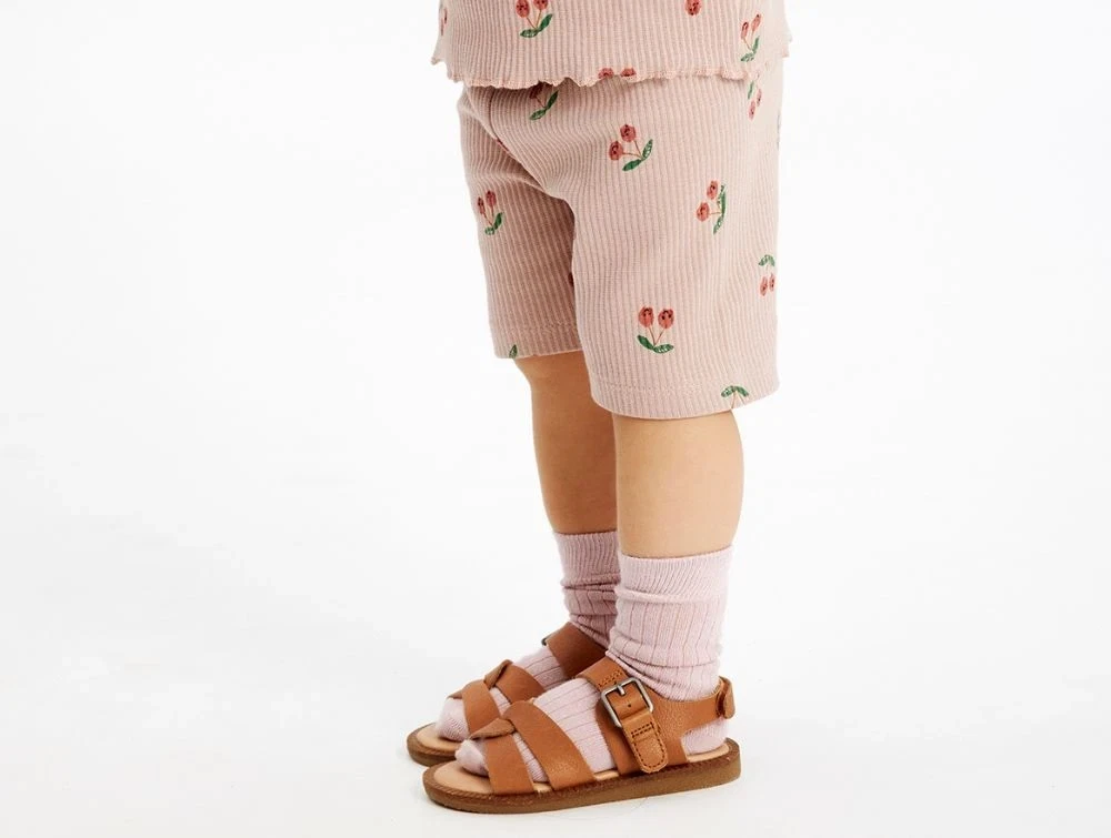Disse søde shorts fra THE NEW Siblings er lavet i støvet rosa rib med et charmerende print af små røde smilende kirsebær. Materialet er blødt og strækbart, hvilket sikrer god bevægelsesfrihed og en behagelig pasform til leg og hverdag. Shortsene har en tætsiddende pasform og elastik i taljen, så de sidder godt uden at stramme.