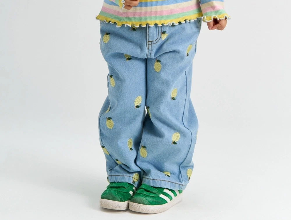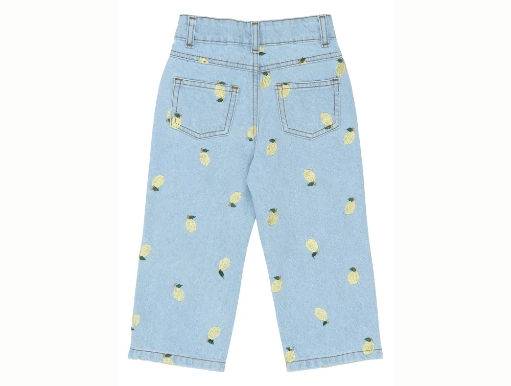 THE NEW Siblings Saja wide jeans light blue denim med citronbroderi forfraTHE NEW Siblings Saja wide jeans light blue denim med citronbroderi vist på barnTHE NEW Siblings Saja wide jeans light blue denim tæt på linningTHE NEW Siblings Saja wide jeans light blue denim set bagfra