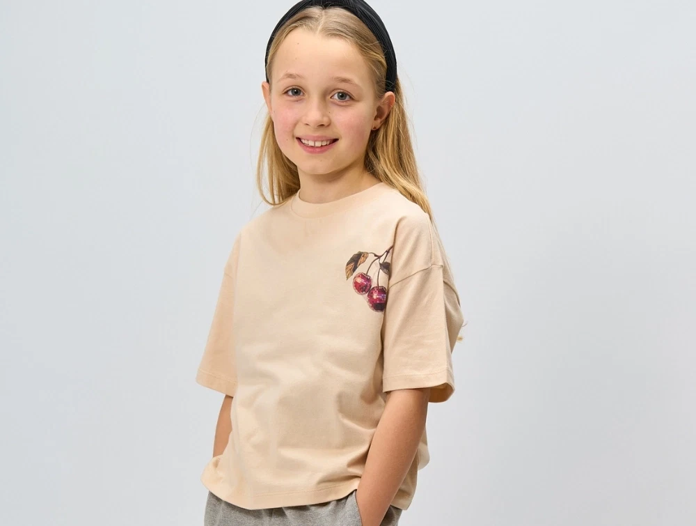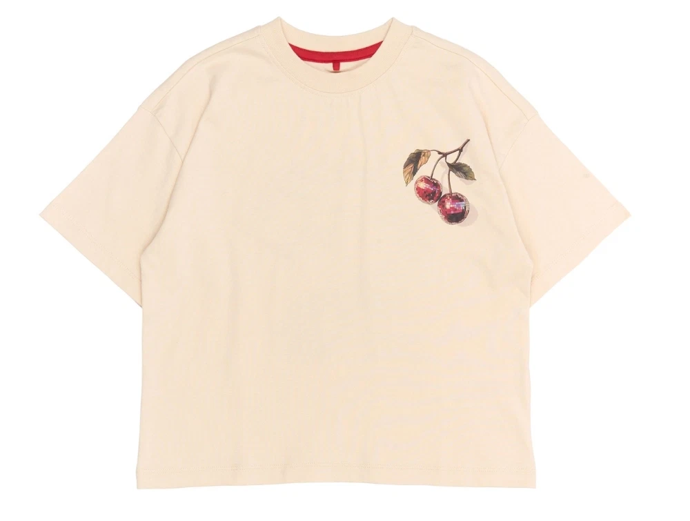 Oversized t-shirt i beige nuance fra THE NEW med kirsebærprint på både bryst og ryg. En moderne og cool style.