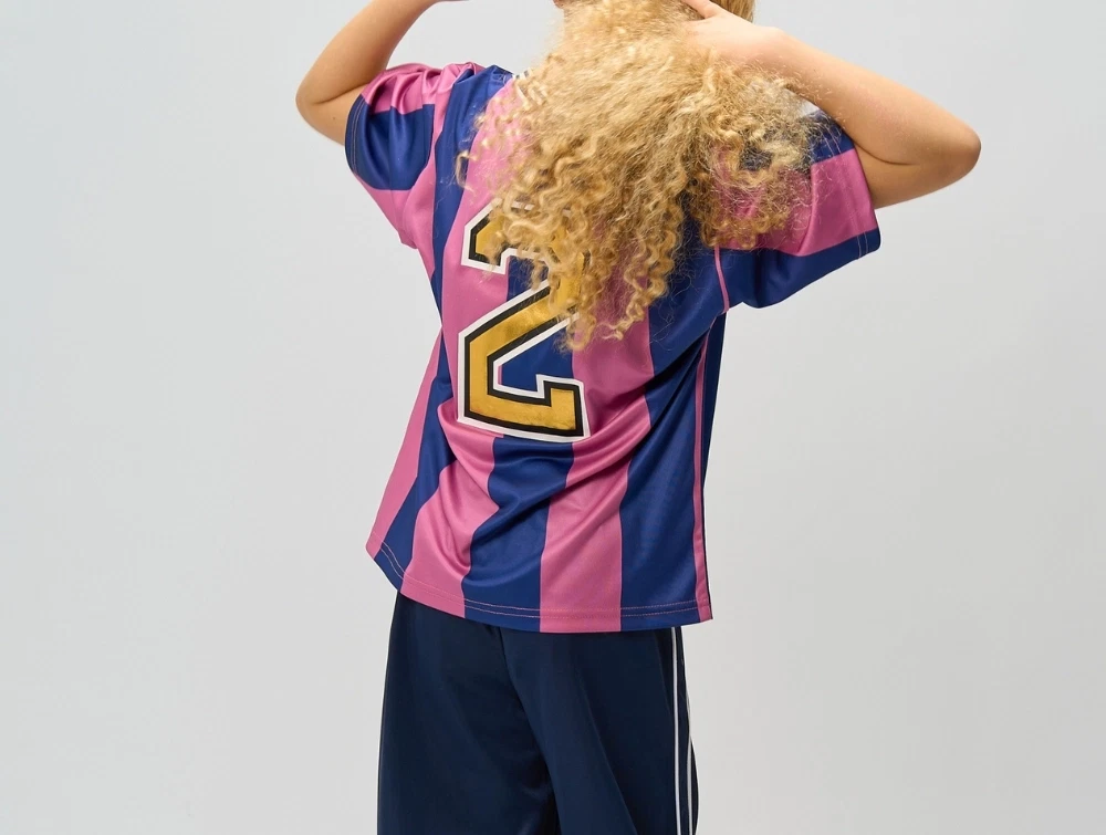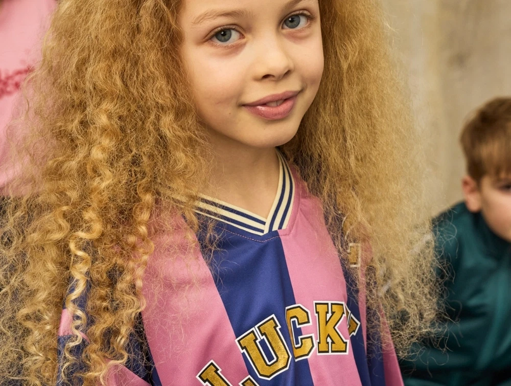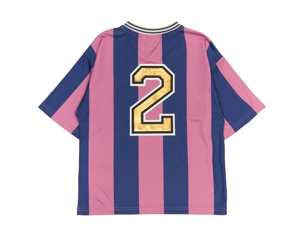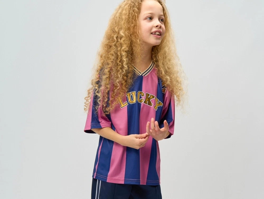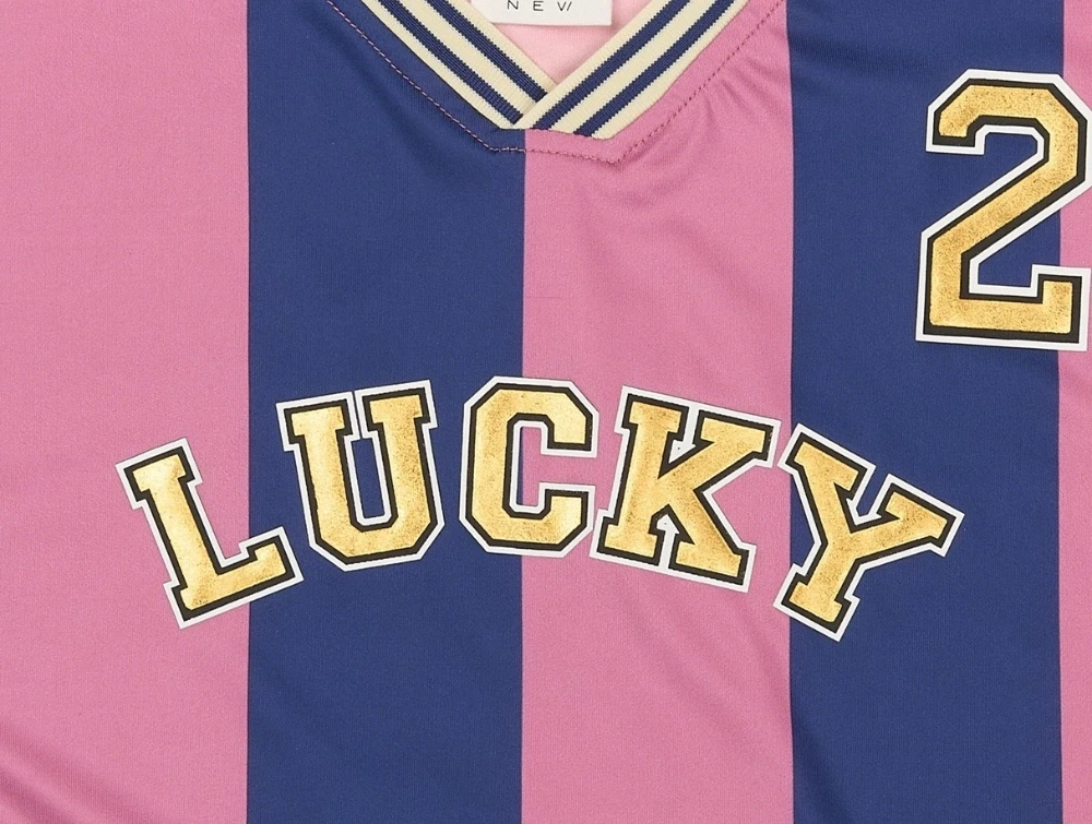 T-shirt fra THE NEW med brede striber i rosa og navy. På brystet står der "Lucky" med et stort guldtryk, mens skuldren og ryggen har tallet "2".