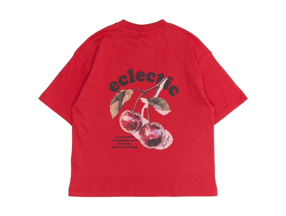 Oversized t-shirt i rød nuance fra THE NEW med kirsebærprint på både bryst og ryg. En moderne og cool style til piger.