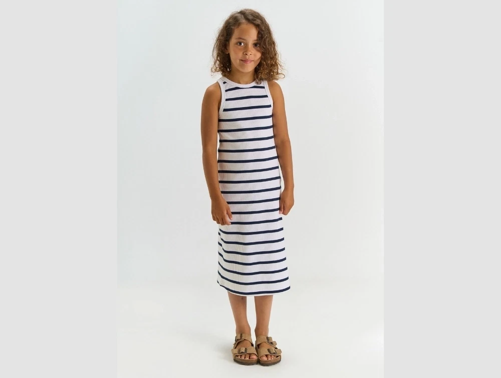 Kjolen er ærmeløs med rund hals og en lang, tætsiddende silhuet, der giver et frisk og sommerligt udtryk. Den strækbare ribkvalitet gør kjolen behagelig at have på og ideel til aktive dage i varmt vejr.