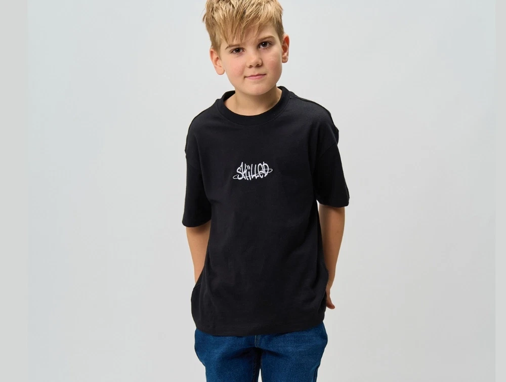 Oversize t-shirt i sort fra THE NEW. Foran er den broderet med et lille "SKILLED"-logo, mens bagsiden har et stort grafisk print med blå terninger og et stort "SKILLED"-motiv. Den bløde bomuldskvalitet giver en behagelig pasform og gør den velegnet til hverdagsbrug.