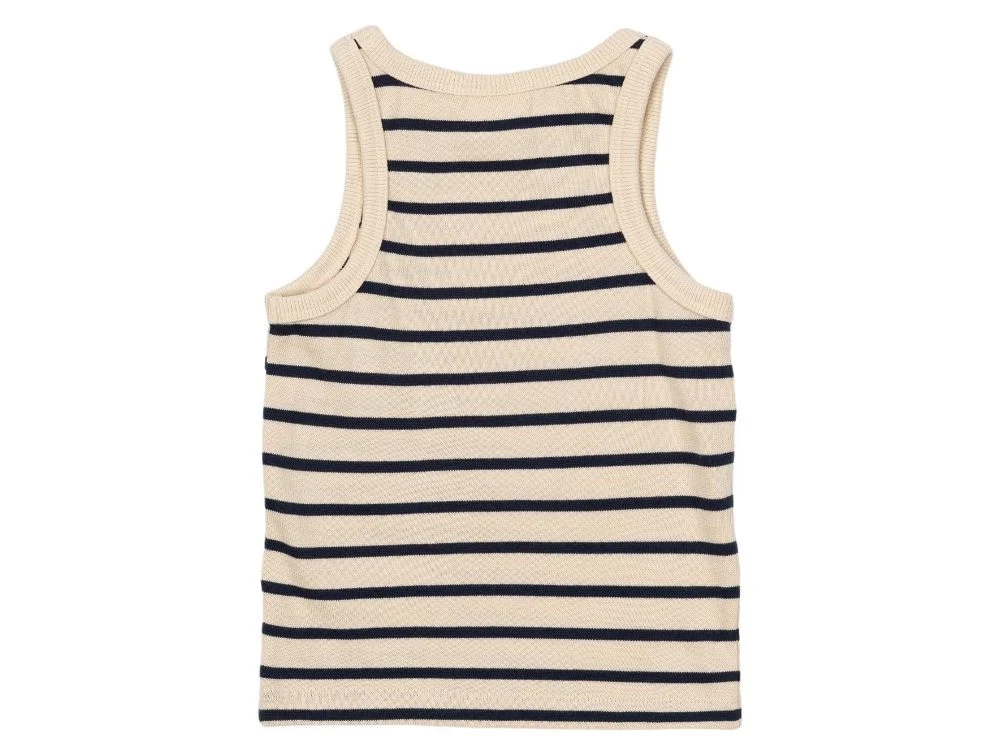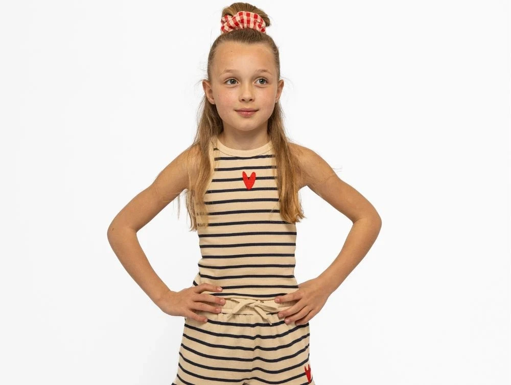Denne ærmeløse top har et klassisk stribet design i råhvid og mørkeblå nuancer, hvilket gør den nem at style til enhver lejlighed. På brystet har den et broderet hjerte i rød, der tilføjer et sødt og unikt touch.