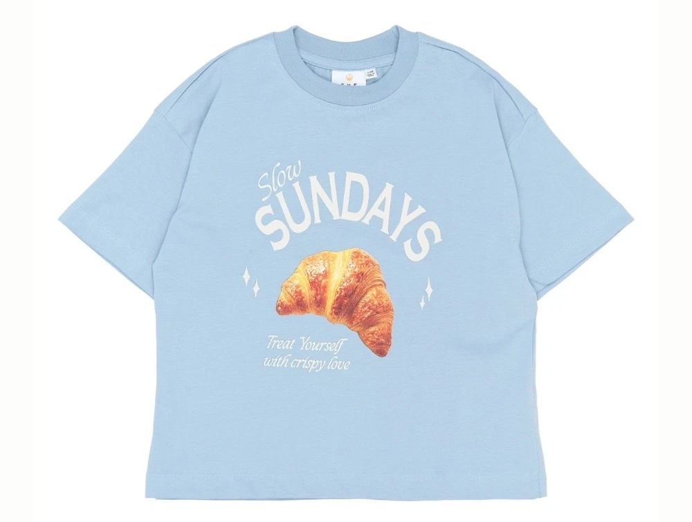 T-shirt i lyseblå nuance (Forever Blue) fra THE NEW med et stort croissant-print og teksten “Slow Sundays”.