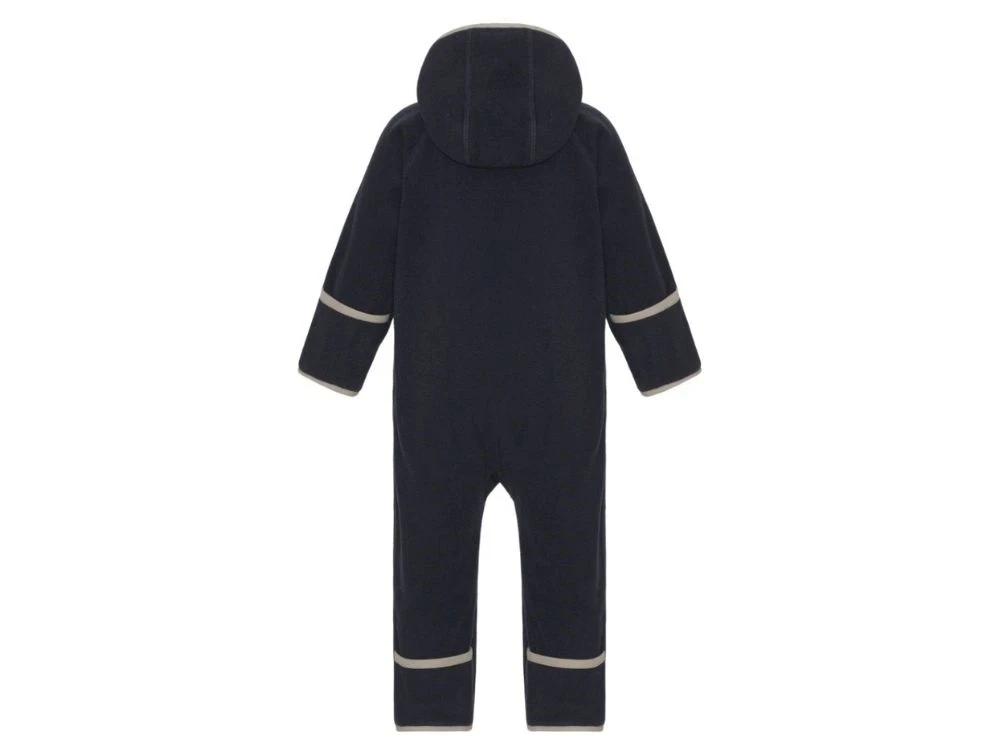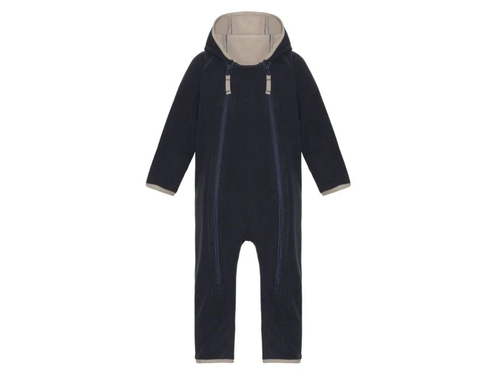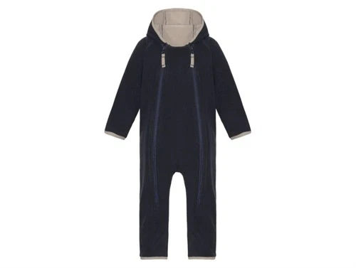 Fleecedragt i farverne navy/mocca med hætte og to praktiske lynlåse fra Ver de Terre. Dragten er lavet af blød og varm fleece med kontrastfarvet inderside. Den har vendbare hånd- og fodstykker, som kan foldes over for ekstra varme. Produceret i 100% polyester.