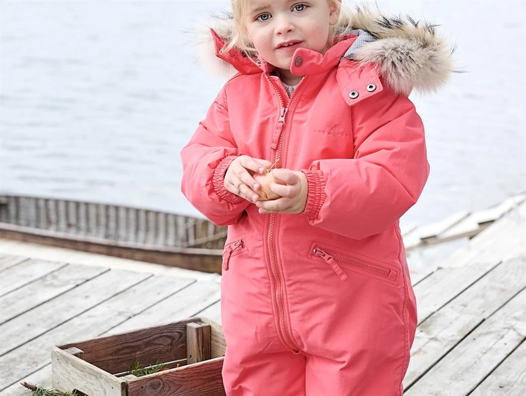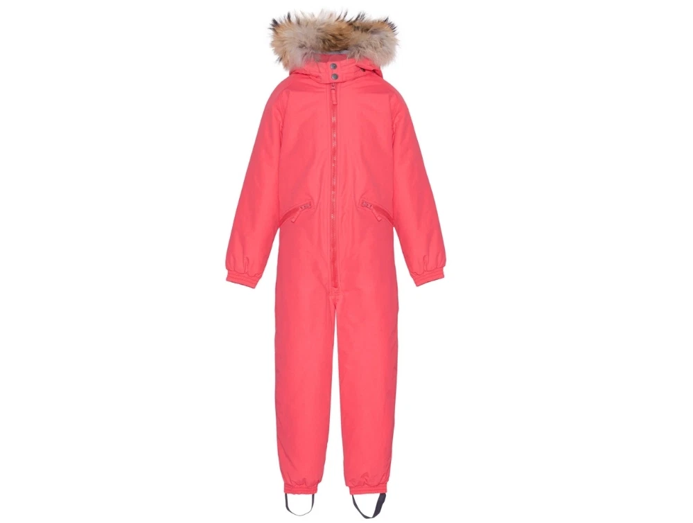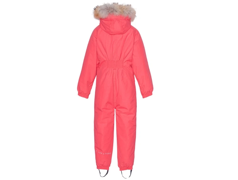 Flyverdragt i pink nuance fra VER de TERRE med Thermolite isolering og aftagelig hætte med SAGA pelskant. Dragten har tapede sømme og et vandtæt ydermateriale med et vandsøjletryk på 10.000 mm, som giver god beskyttelse mod regn og sne.