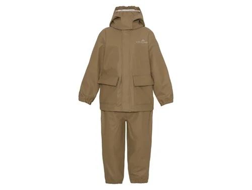 Regnsæt i gummi med bukser og jakke i farven caramel fra Ver de Terre. Regnjakken har to lommer og en aftagelig hætte med trykknapper. Bukserne er designet med seler og aftagelige fodstropper op til og med størrelse 3 år, mens bukser fra størrelse 4 år og opefter har justerbar elastik i taljen. Sættet er fremstillet i blødt, vandtæt PU-materiale med svejsede sømme. Bemærk, at PU-belægningen kan blive slidt eller få huller ved kontakt med sand, sten eller skarpe genstande. Vandtæthed: 10.000 mm. Produceret i 70% polyester, 30% polyurethan. Vaskes ved maks. 30°C på skåneprogram.