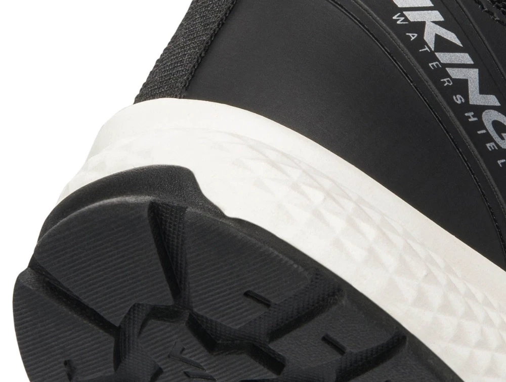 Viking Equip Mid WP er en slidstærk overgangsstøvle til børn i sort med sporty design. Skoen har et mellemhøjt skaft og en forstærket overdel med støtteramme, som giver ekstra støtte og stabilitet. Den dobbelte velcrolukning gør det nemt for barnet at justere pasformen selv, og Vikings vandafvisende Watershield membran hjælper med at sikre tørre fødder.