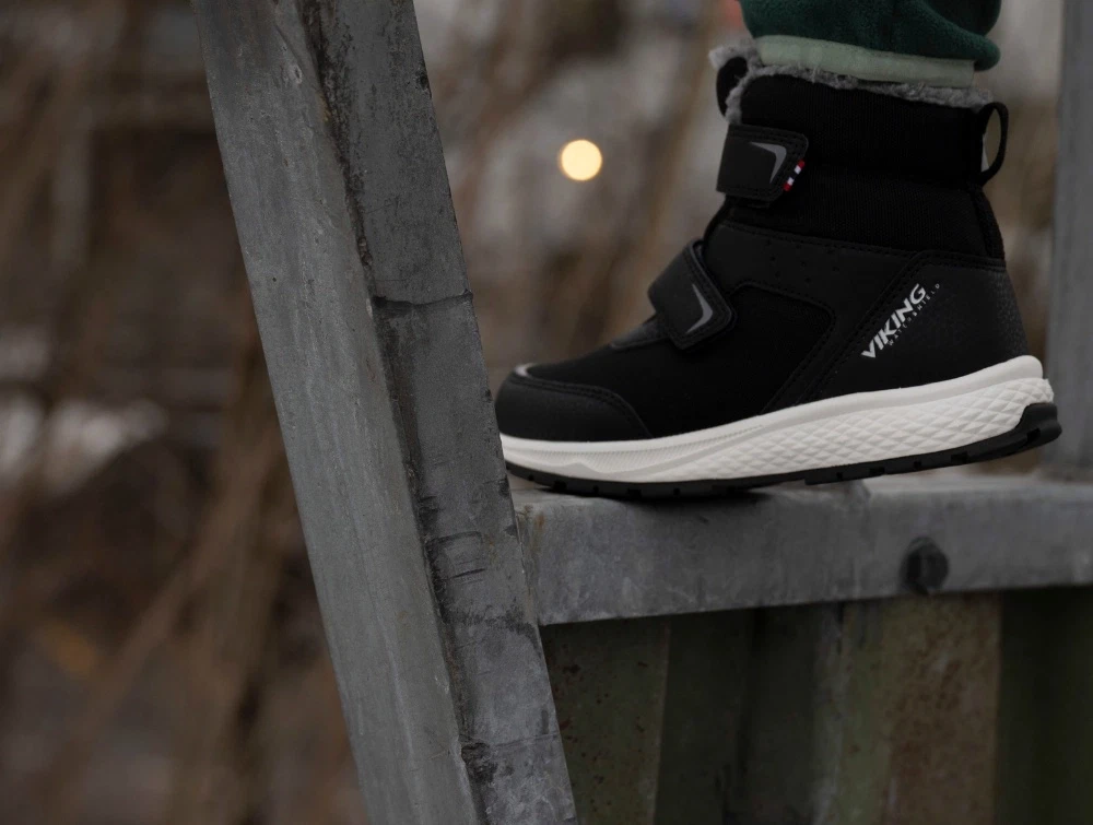 Viking Equip Warm er en vinterstøvle til børn i sort og grå, designet til kolde og våde dage. Støvlen har en vandtæt Watershield membran, der holder fødderne tørre, og et blødt, varmt for, som gør støvlerne egnede til koldt vejr. Den dobbelte velcrolukning gør det nemt for barnet selv at tage støvlerne af og på. Ydersålen i gummi er mønstret for ekstra godt fodfæste, mens EVA-mellemsålen sørger for en let og behagelig stødabsorbering. Foran er støvlen udstyret med en ekstra beskyttelse ved tåen, som giver højere slidstyrke på snuden.