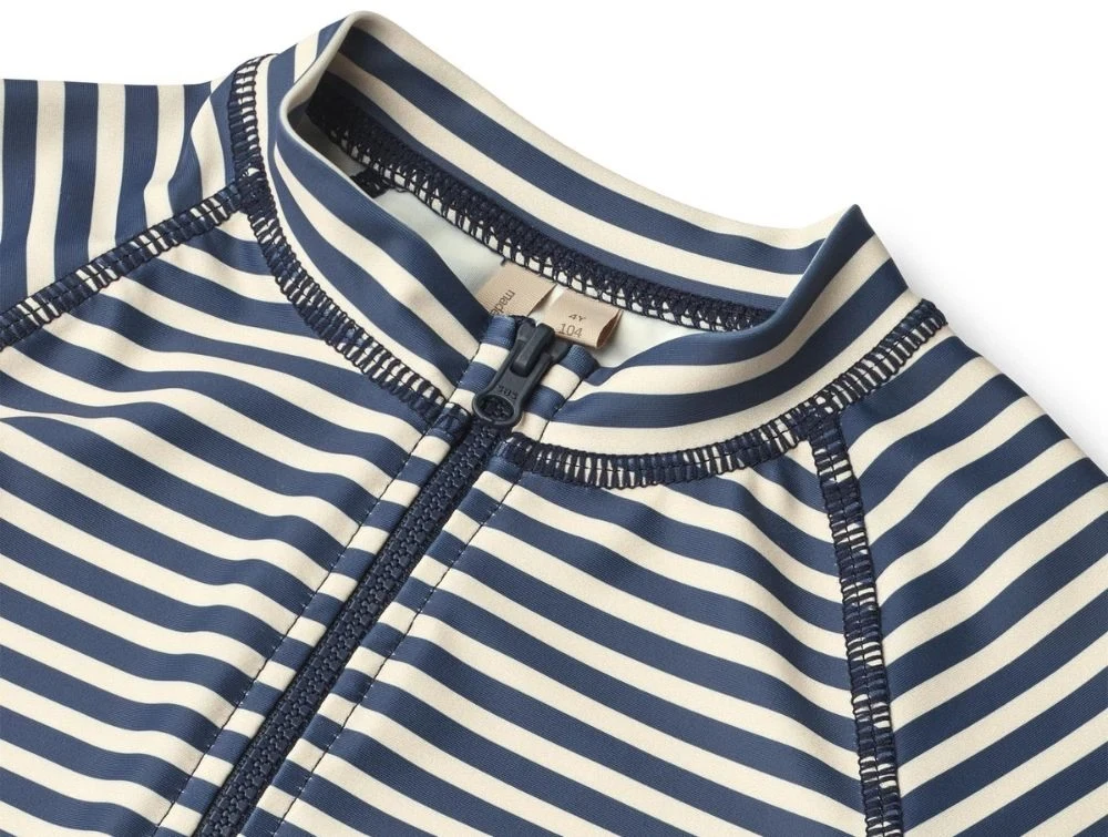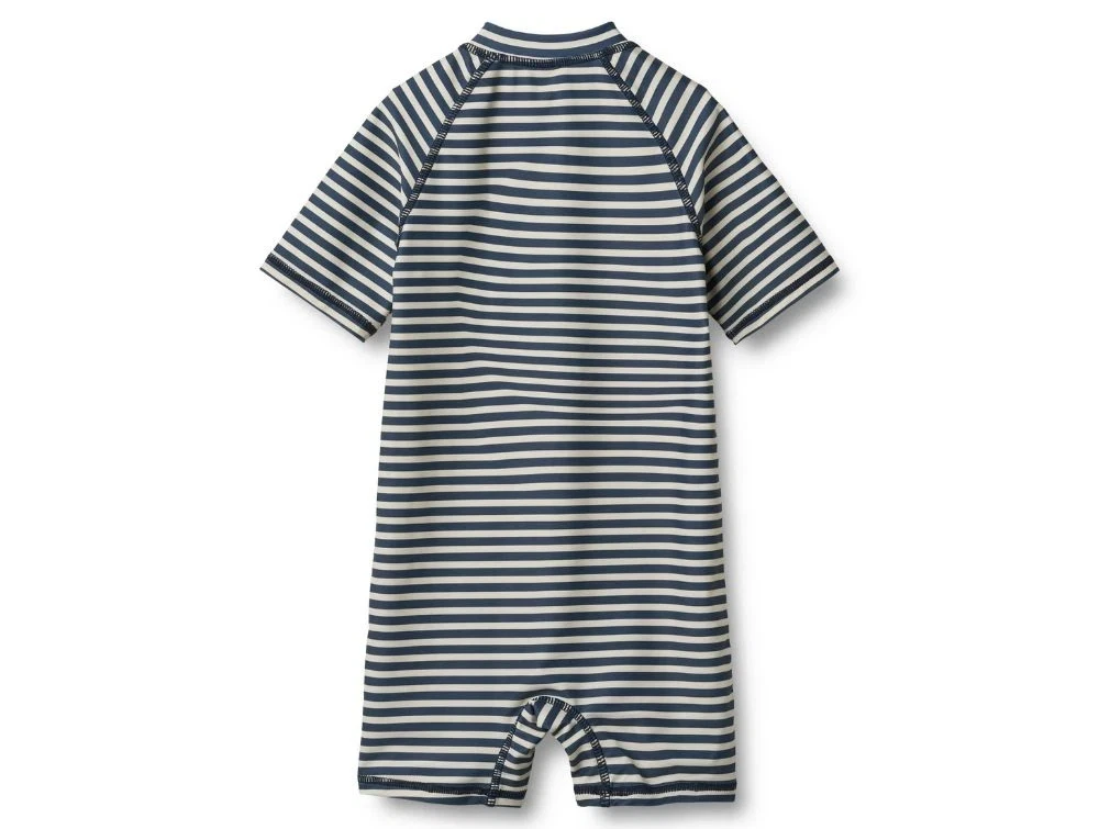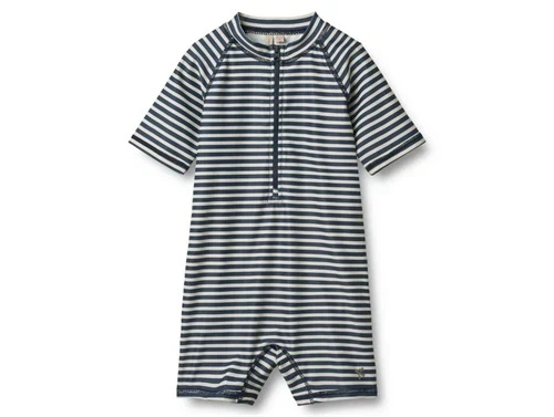 Klassisk badedragt fra Wheat med striber (blue stripe) i en tidløs kombination af råhvid og mørkeblå. Modellen har korte ærmer og ben samt en lille krave, der beskytter nakken mod solen.