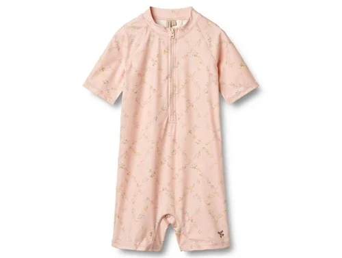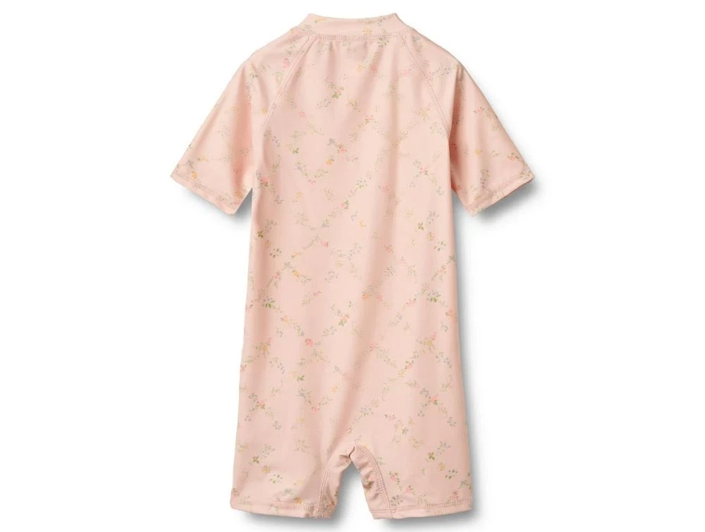Blomstret badedragt i farven pudder (powder checked flowers) med korte ærmer og ben fra Wheat.