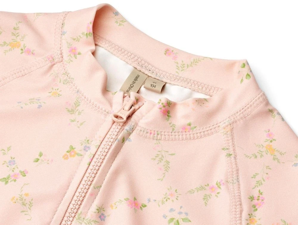 Klassisk badedragt fra Wheat i en smuk pudderfarve med et unikt ternet mønster dannet af fine blomster. Modellen har korte ærmer og ben samt en lille krave, der beskytter nakken mod solen.
