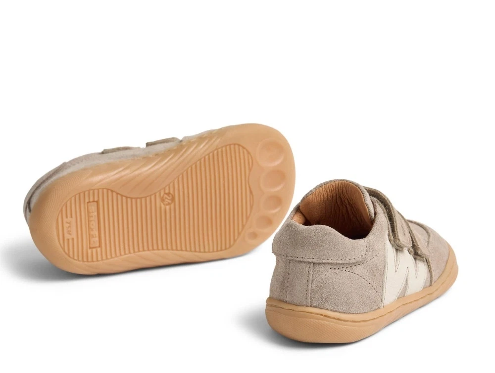 Sneaker i beige nuance fra Wheat. Modellen Barres er en fleksibel og let barfodssko i ruskind og læder med dobbelte velcroremme, der gør den nem at justere til barnets fod.