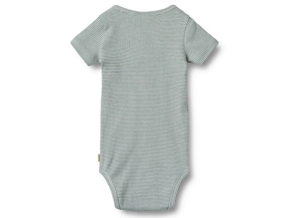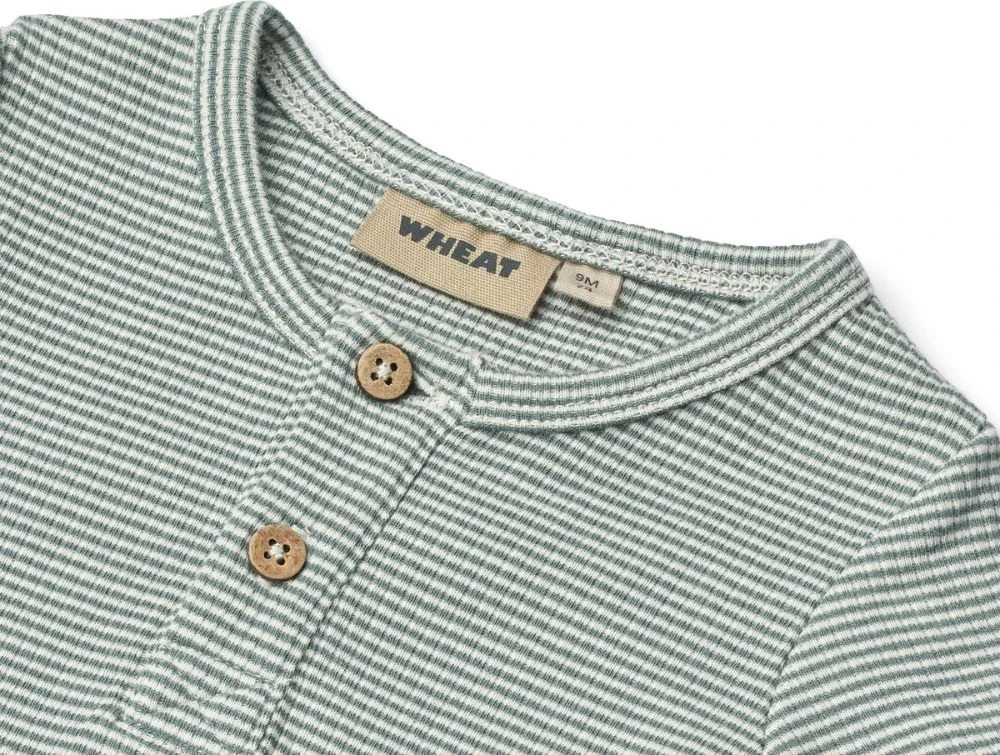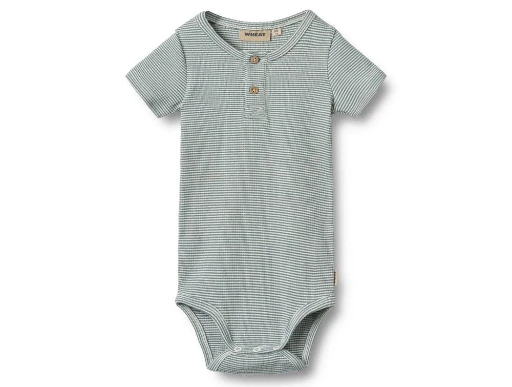Blød og strækbar body fra Wheat i en fin ribstrikket kvalitet med striber i blågrøn (stormy sea) og hvid. Fremstillet af økologisk bomuld, der sikrer en behagelig pasform og høj komfort.