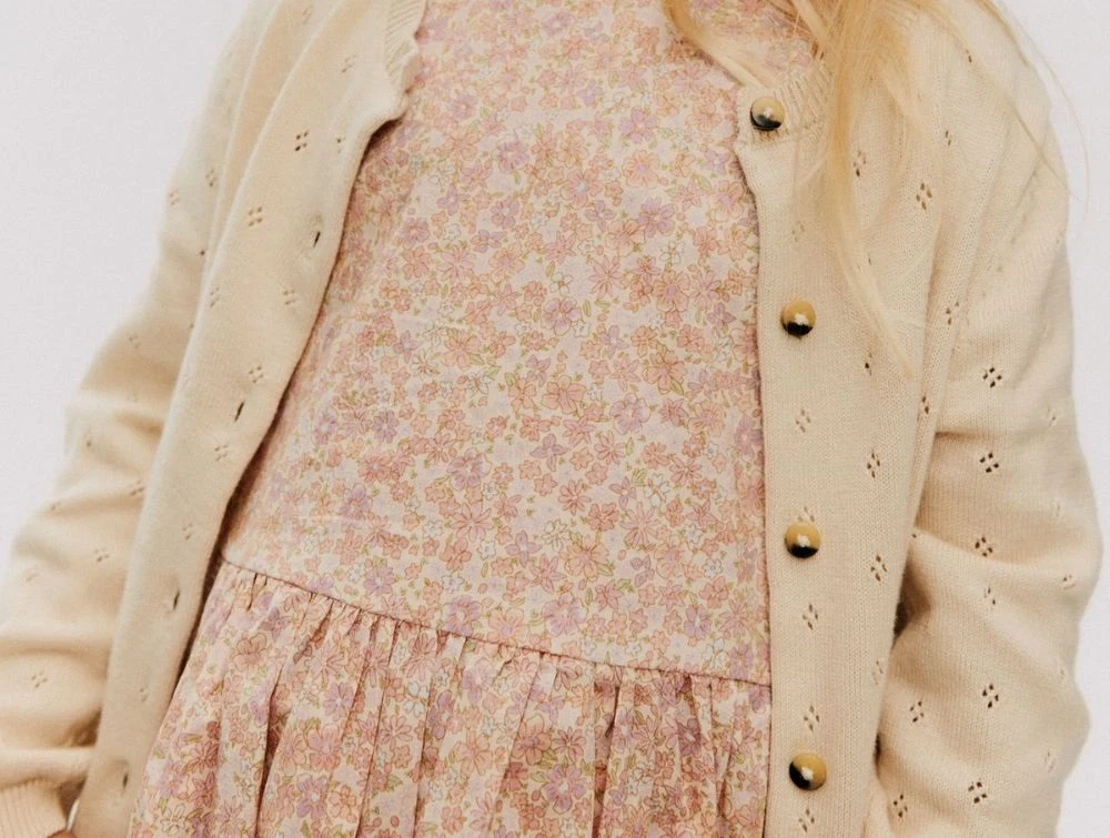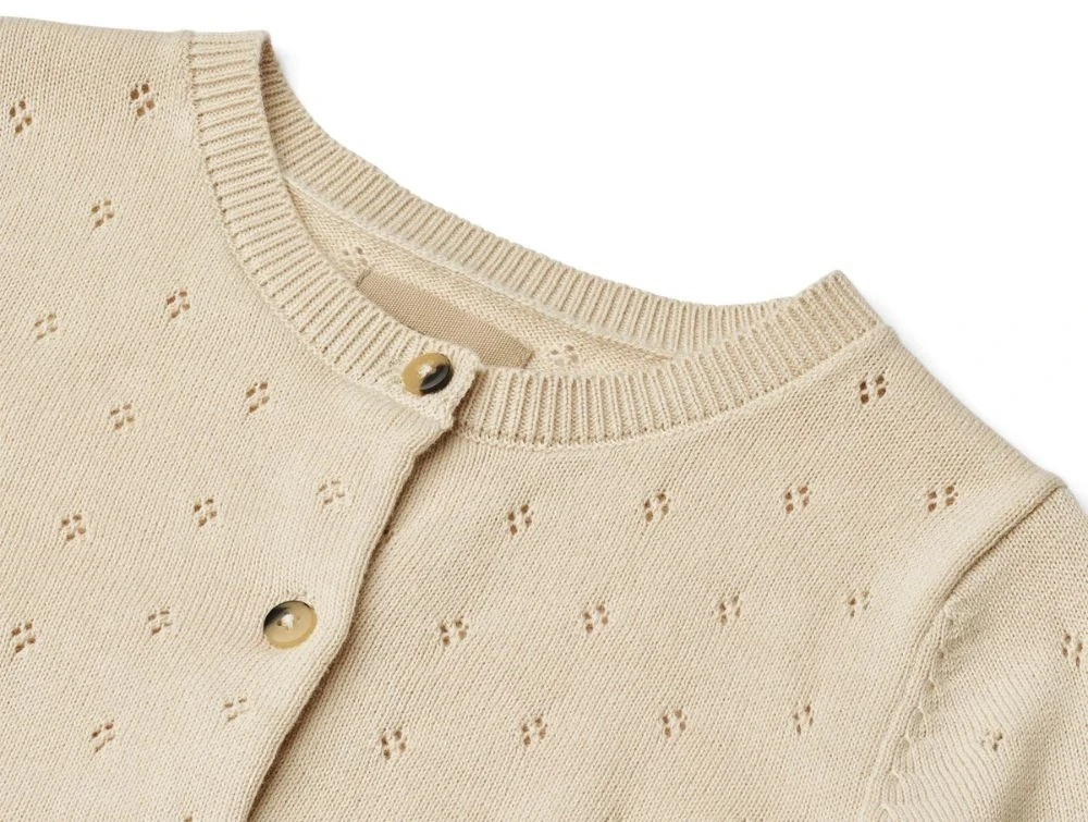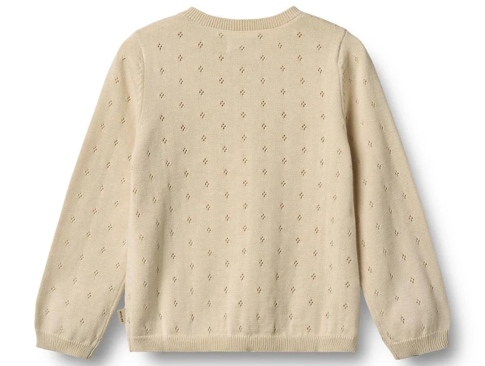 Blød langærmet bomuldscardigan fra Wheat i en lys varm sandfarve. Den har et fint hulmønster og en let A-formet silhuet, der giver et klassisk og tidløst udtryk.