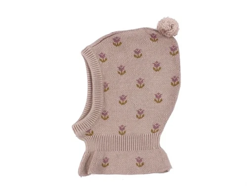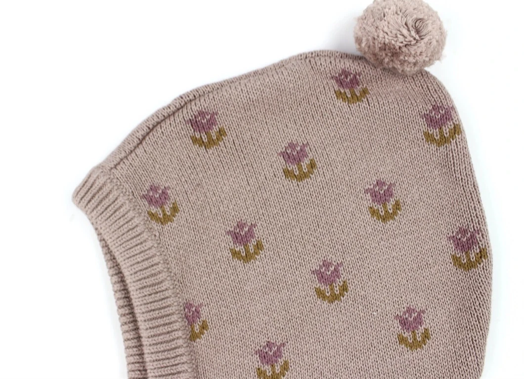 Blød strikket elefanthue i økologisk bomuld med jacquardmønster, pom pom og ribkanter omkring ansigt.
