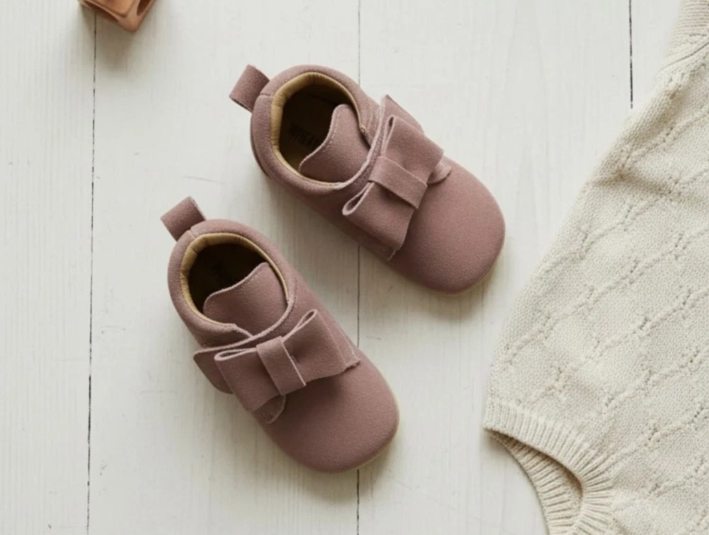 Ruskindshjemmesko i farven dusty rouge med stor sløjfe fra Wheat. Hjemmeskoene lukkes nemt med velcrorem.