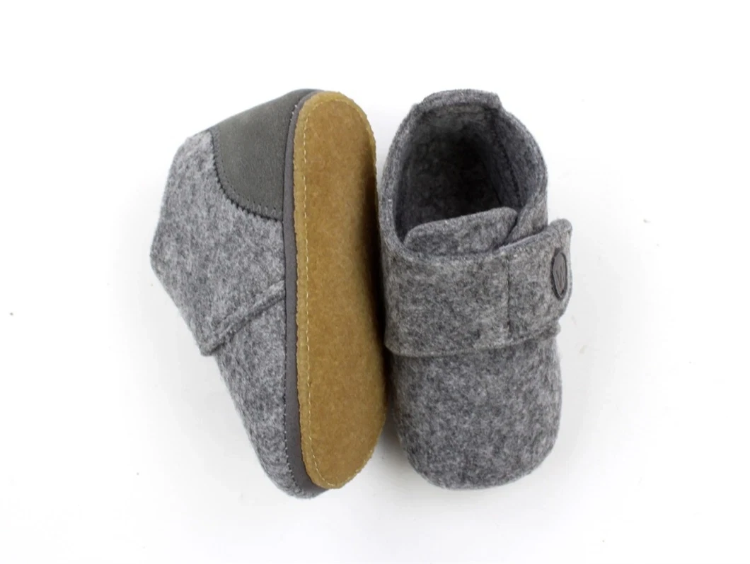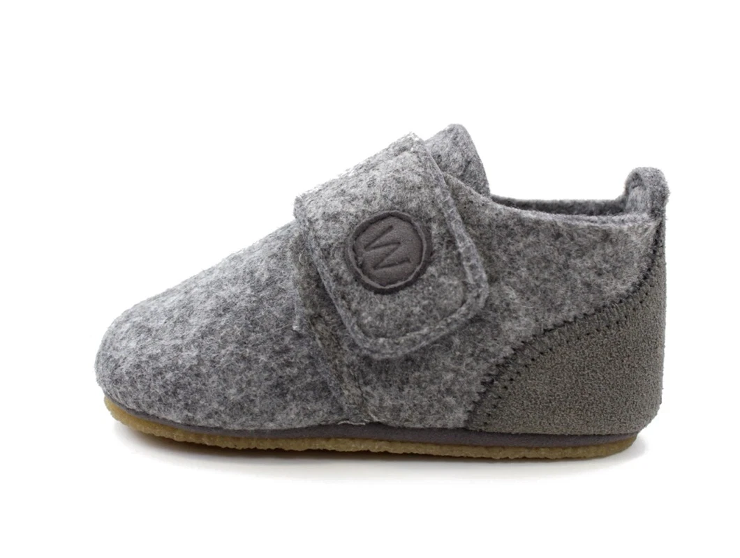 Grå uldfilthjemmesko fra Wheat. Hjemmeskoene lukkes nemt med velcrorem.