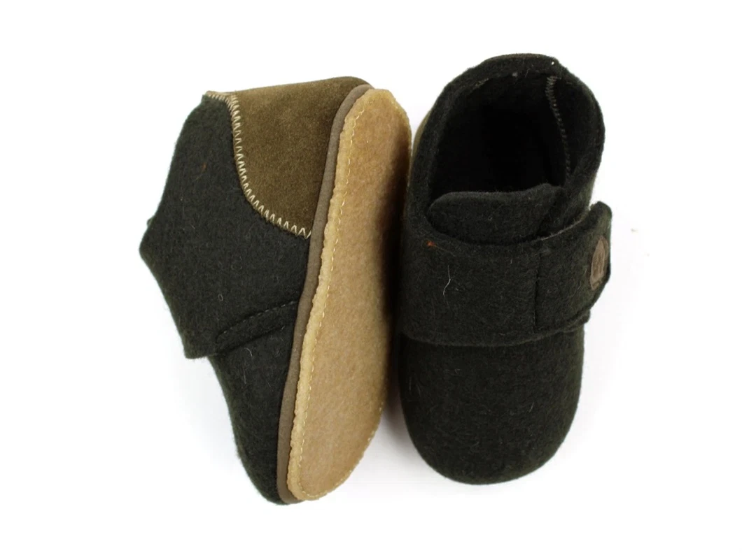 Uldfilthjemmesko i farven olive fra Wheat. Hjemmeskoene lukkes nemt med velcrorem.