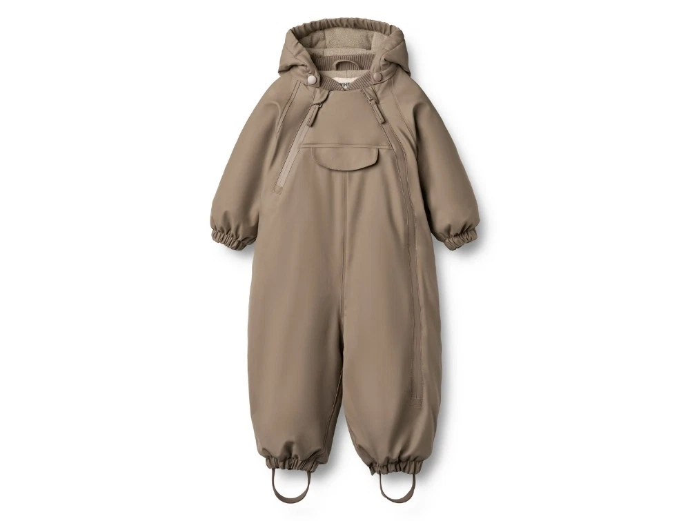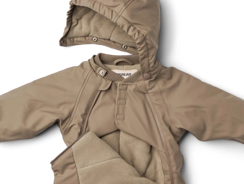 Flyverdragt i brunlig nuance (dry wood) fra Wheat med åndbar og vandtæt overflade, blød fleece indvendigt og praktiske vinterdetaljer.