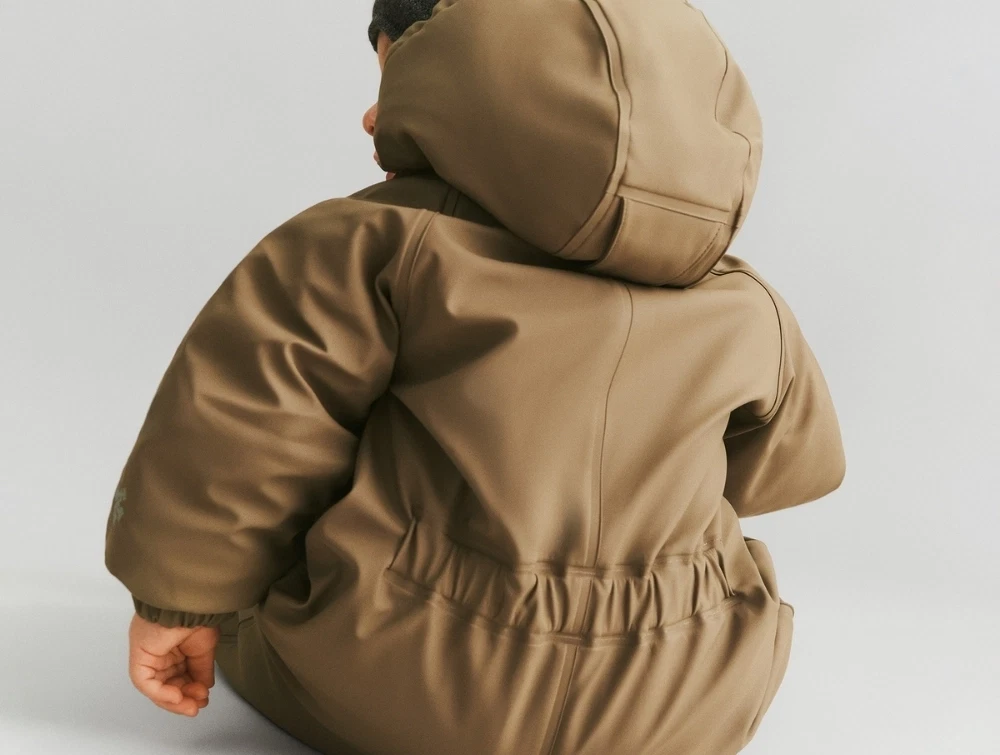 Baby iført Wheat flyverdragt dry wood med gummistropper og lynlåsWheat flyverdragt dry wood med fleecefoer og dobbeltlynlås set forfraWheat flyverdragt dry wood med elastik i taljen og refleks bagpåWheat flyverdragt dry wood med aftagelig hætte og synligt foerBaby iført Wheat flyverdragt dry wood hætte bagfra
