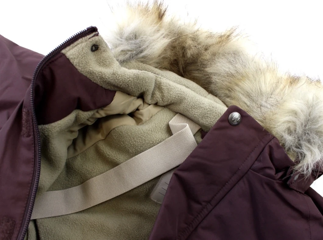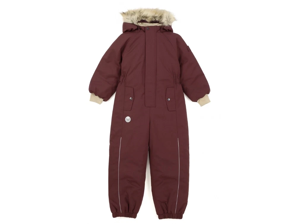 Flyverdragt i farven eggplant fra Wheat. Flyverdragten har en aftagelig hætte med trykknapper og syntetisk pels, som kan tages af med knapper.