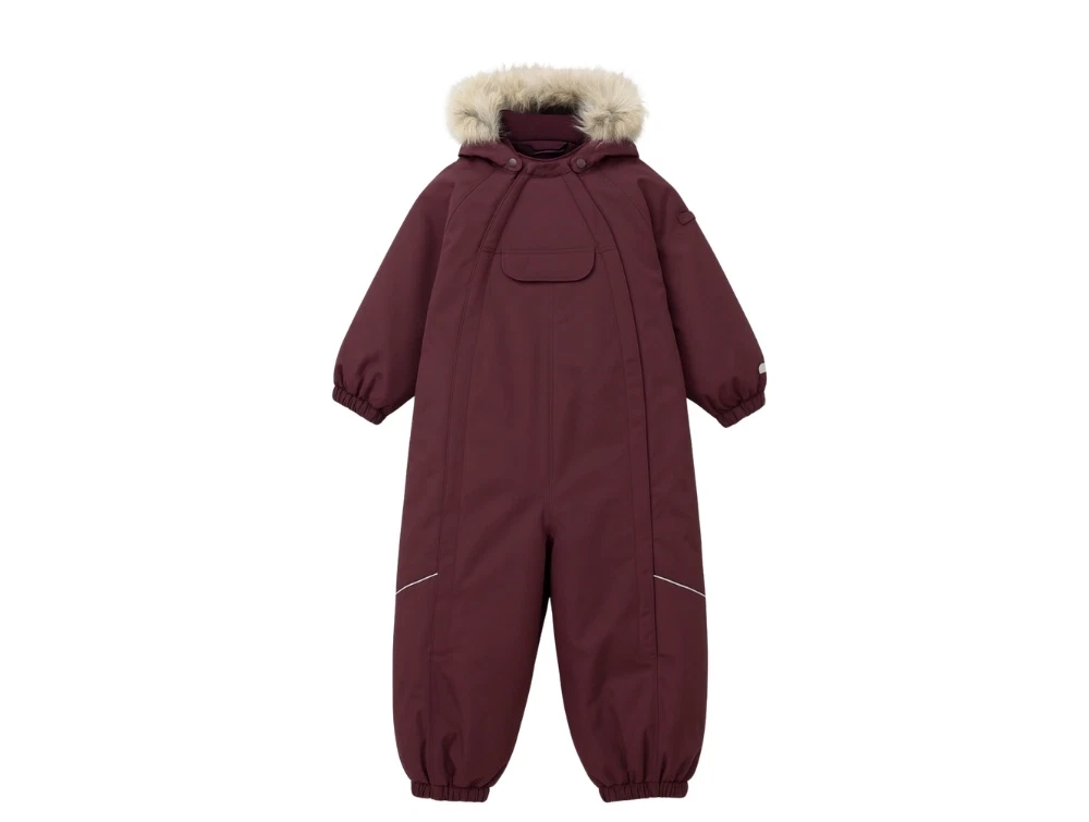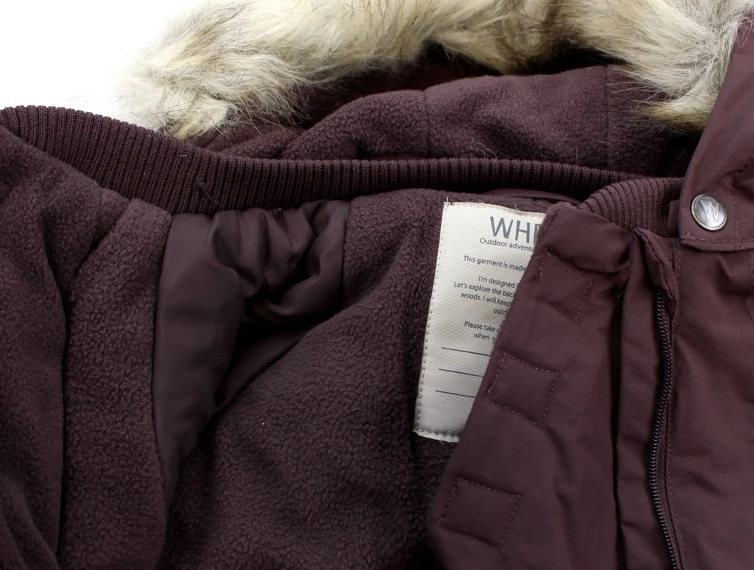 Flyverdragt i farven eggplant fra Wheat. Flyverdragten har en aftagelig hætte med trykknapper og syntetisk pels, som kan tages af med knapper.