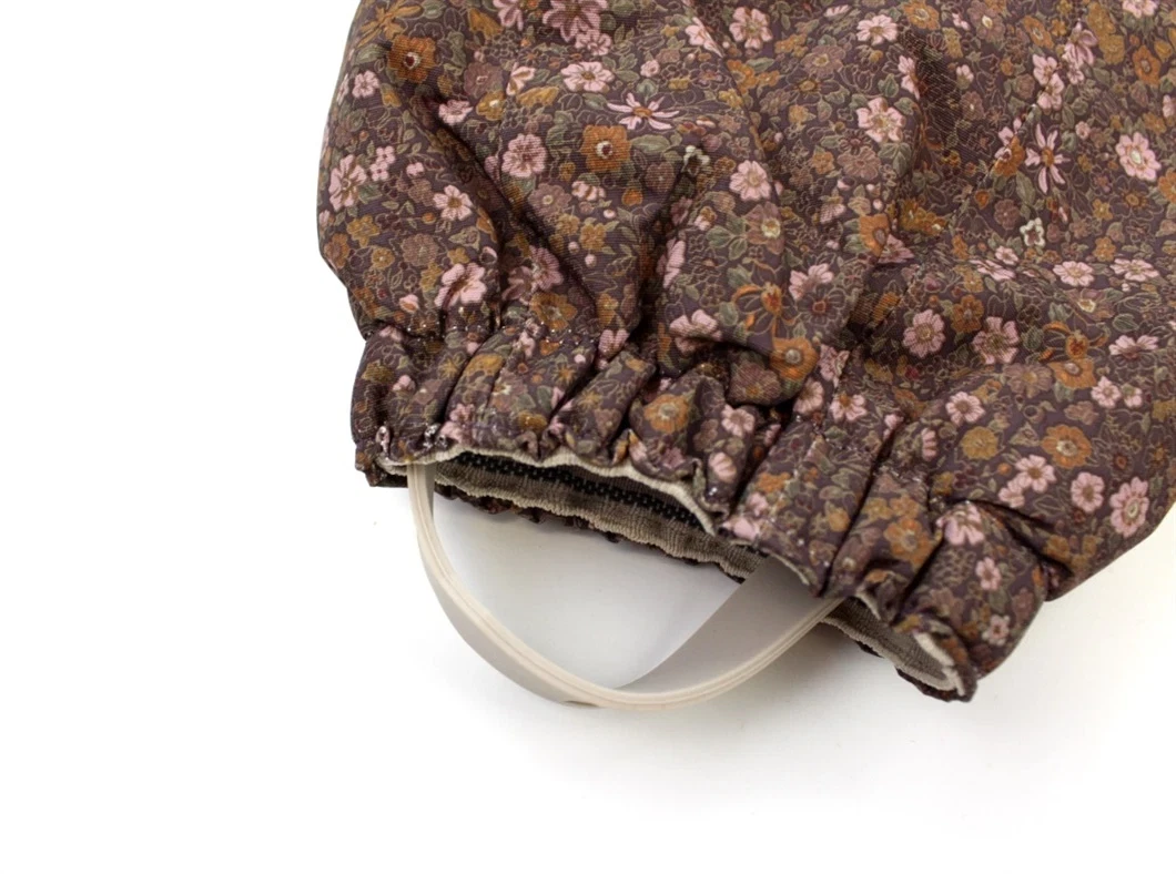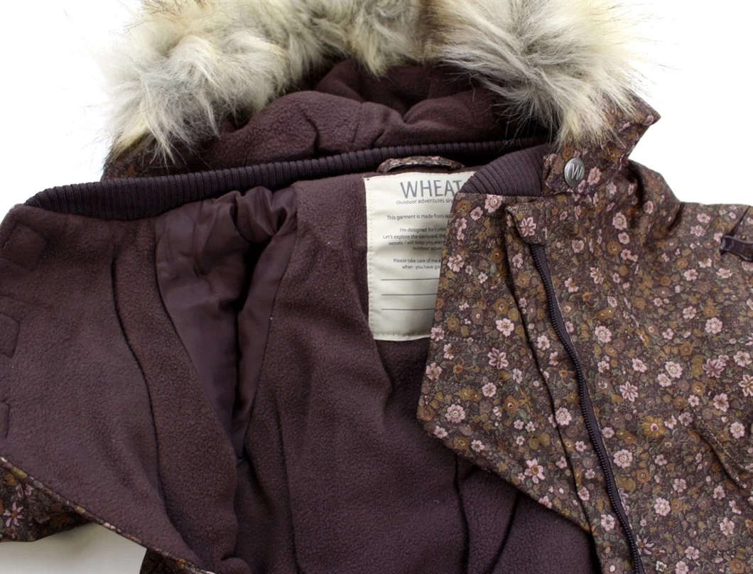 Flyverdragt i farven eggplant flowers med blomsterprint fra Wheat. Flyverdragten har en aftagelig hætte med trykknapper og syntetisk pels, som kan tages af med knapper.