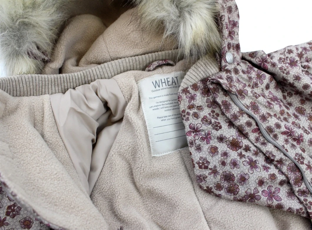 Flyverdragt i farven winter blush flowers med blomsterprint fra Wheat. Flyverdragten har en aftagelig hætte med trykknapper og syntetisk pels, som kan tages af med knapper.