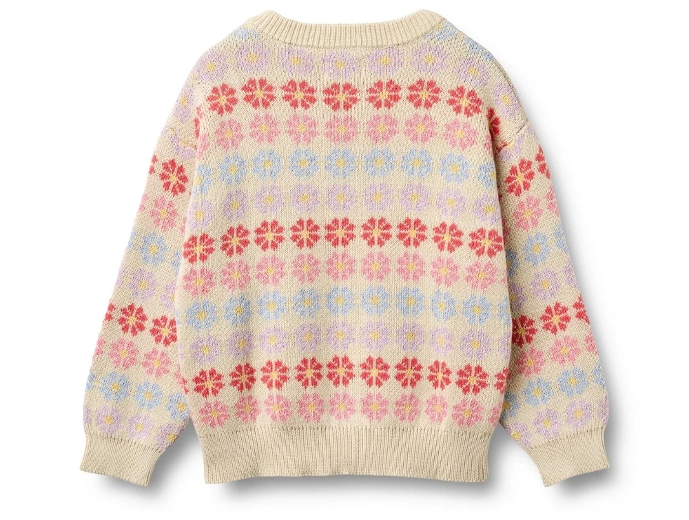 Pige iført Wheat Harlow striktrøje sandshell flowersWheat Harlow striktrøje sandshell flowers i bomuldDetalje af Wheat Harlow striktrøje sandshell flowersBagside af Wheat Harlow striktrøje sandshell flowers