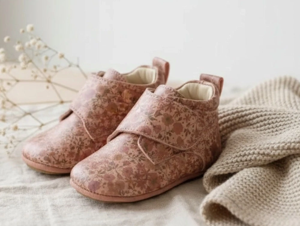 Læderhjemmesko i farven rose sand med blomsterprint fra Wheat. Hjemmeskoene lukkes nemt med velcrorem.