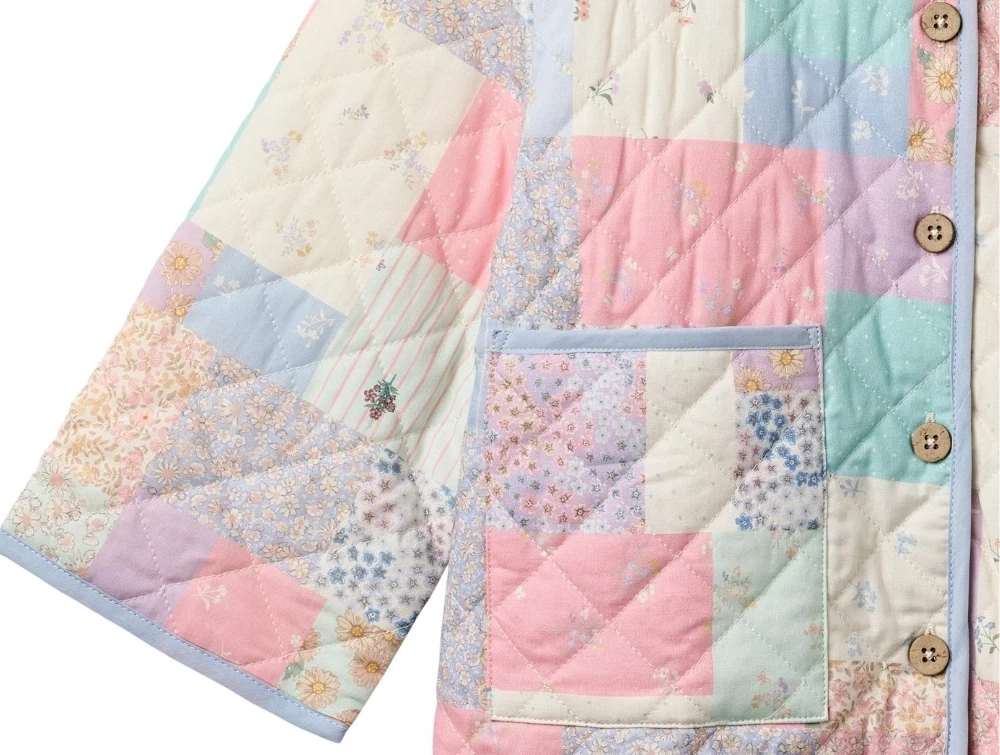 Quiltet jakke med blomstret patchworkprint (patchwork flowers) i sarte pastelfarver fra Wheat.