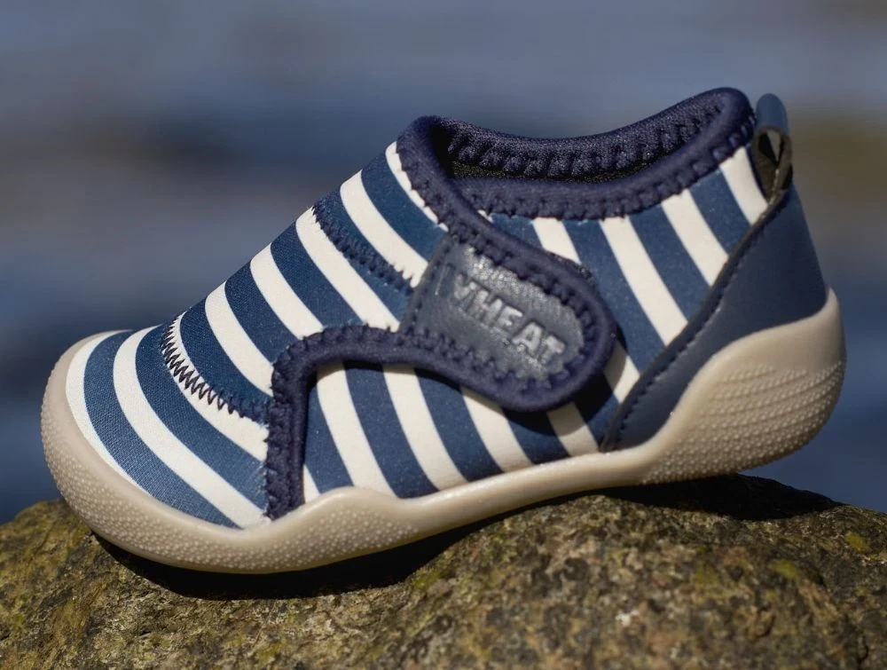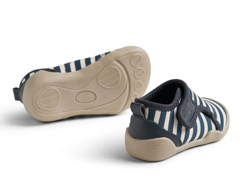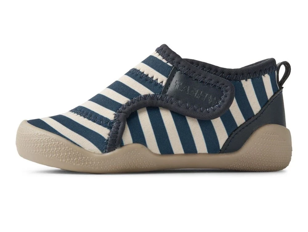 Badesko/strandsko i blå og råhvide striber fra Wheat.