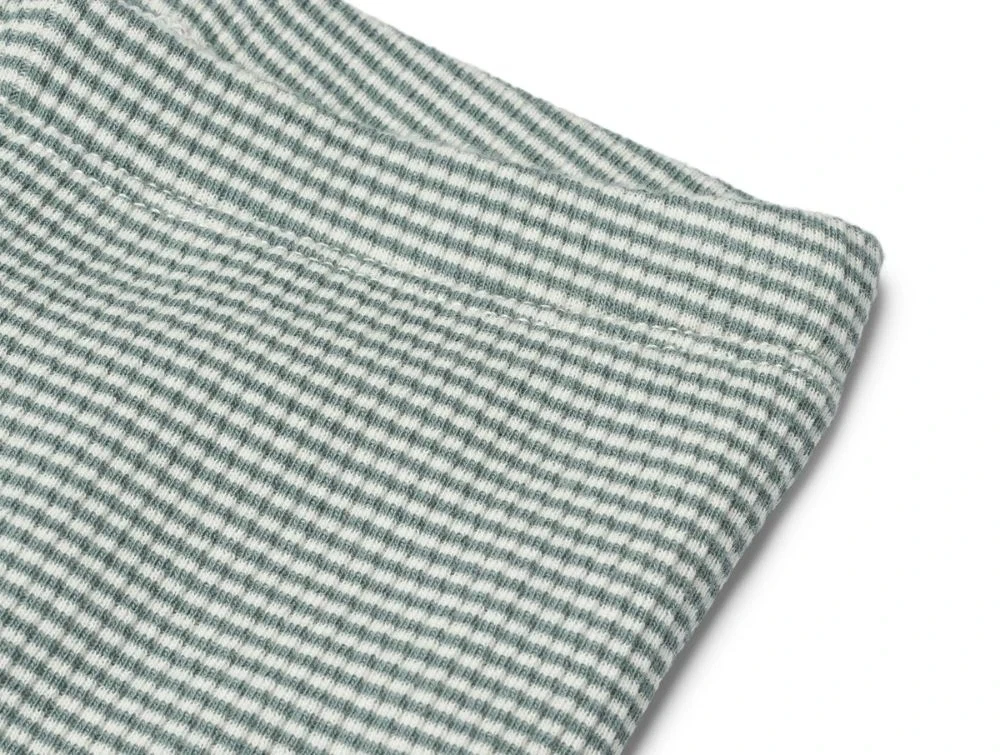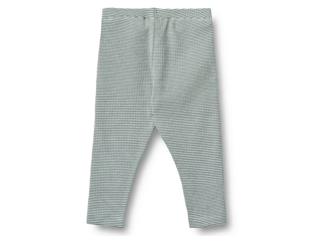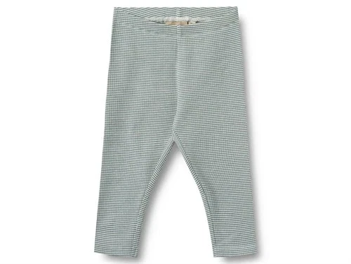 Bløde og behagelige leggings fra Wheat i en fin ribstrikket kvalitet med striber i blågrøn (stormy sea) nuance og hvid. Fremstillet i økologisk bomuld med stræk, der sikrer en god pasform og høj komfort.