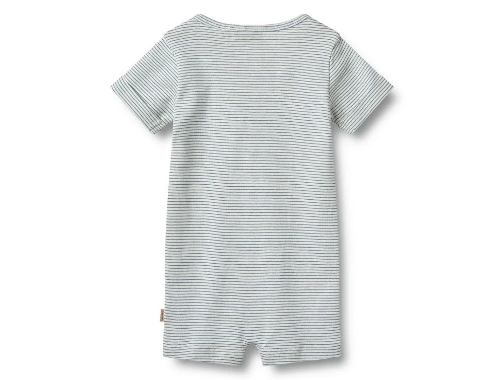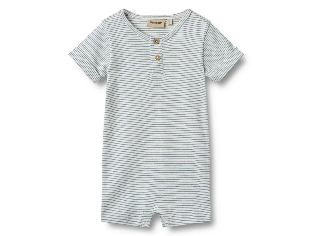 Kortærmet jumpsuit med korte ben og med blå striber (blue stripe) fra Wheat.