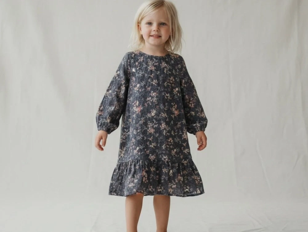 Kjole i farven greyblue med Bambi- og blomsterprint fra Wheat.
