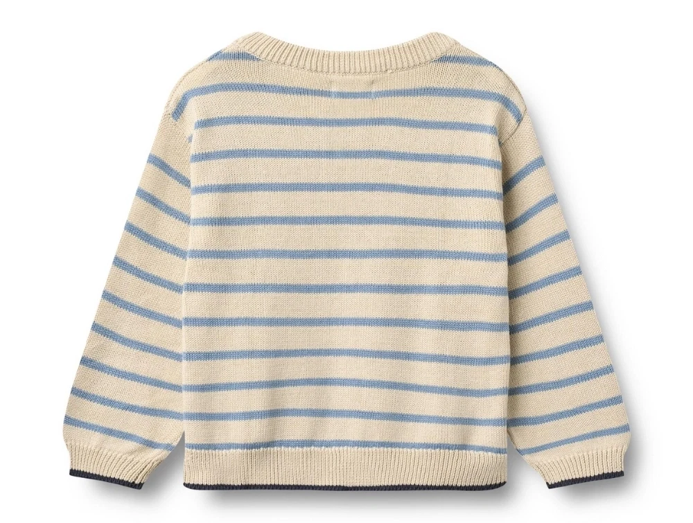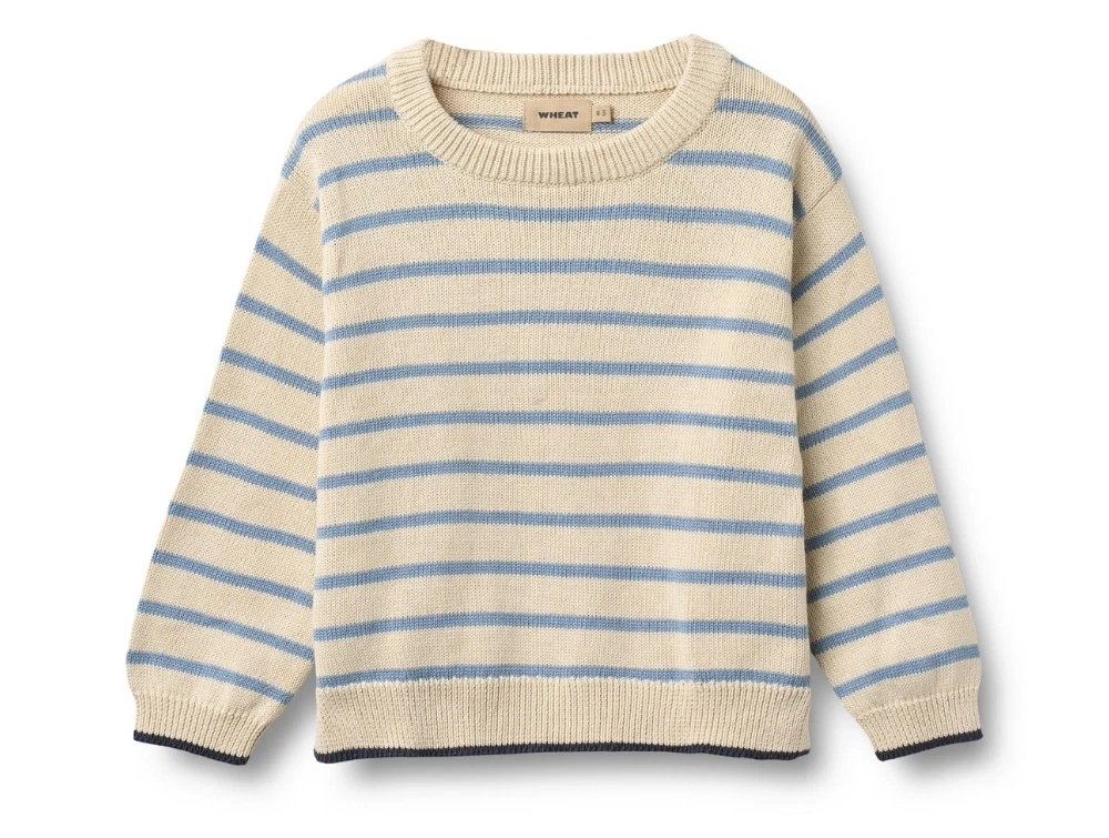 Striktrøje i beige nuance med lyseblå striber (faded denim stripe) fra Wheat.