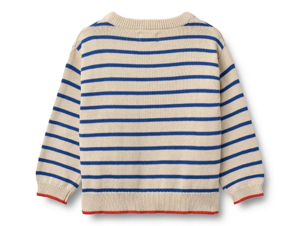 Striktrøje i beige nuance med blå striber og røde detaljer (true blue stripe) fra Wheat.