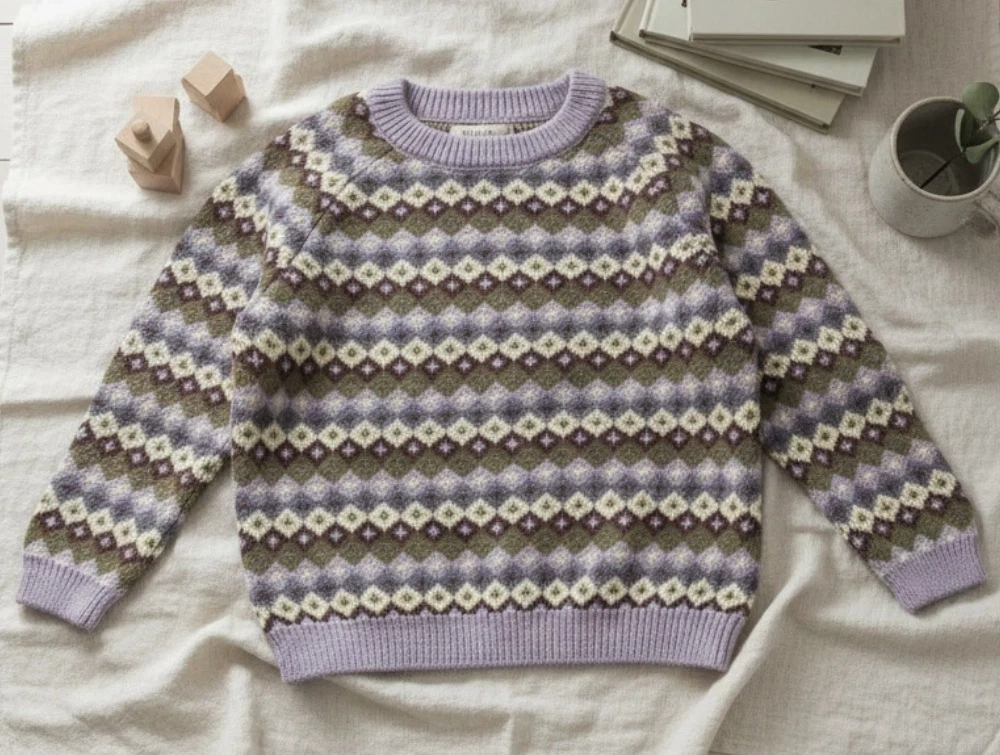 Smuk striktrøje med jacquard-mønster i farvetemaet multi lavender fra Wheat.