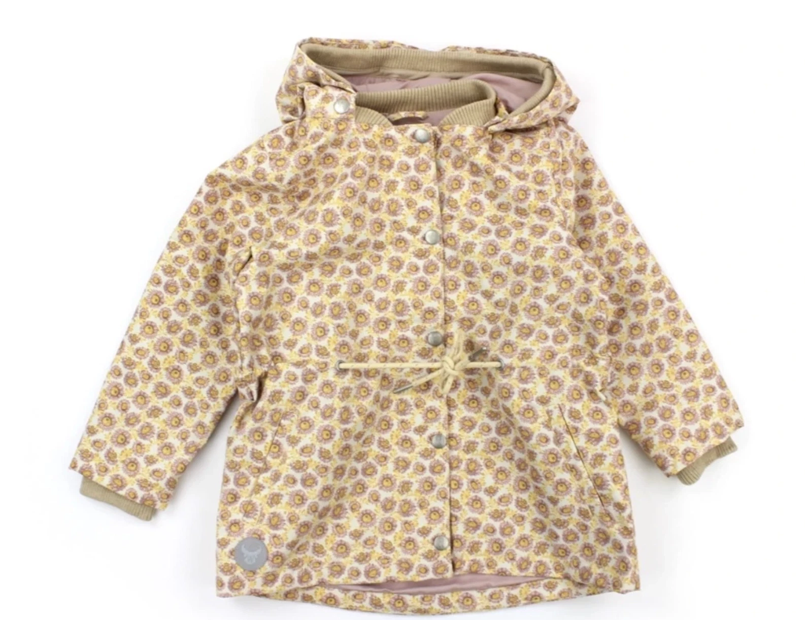 Overgangsjakke med blomsterprint fra Wheat. Jakken har aftagelig hætte med trykknapper samt to lommer.
