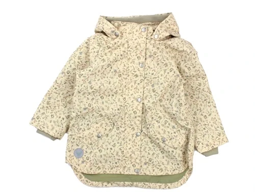 Overgangsjakke i farven wild flowers med print fra Wheat. Jakken har aftagelig hætte med trykknapper samt to lommer.