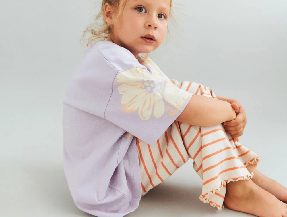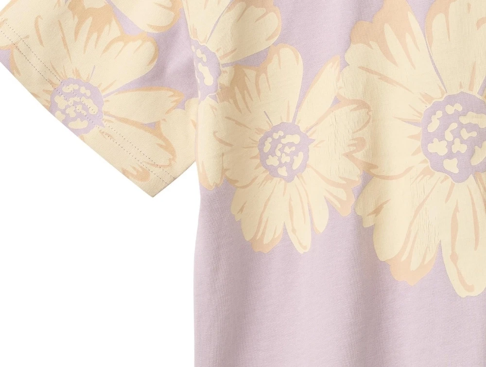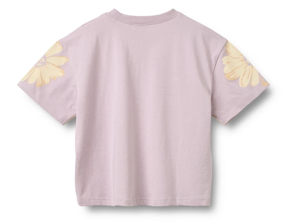 Wheat Petri t-shirt i lavender med store blomster forfraWheat Petri t-shirt i lavender med blomsterprint på barnWheat Petri t-shirt i lavender detalje af blomsterprintWheat Petri t-shirt i lavender set bagfra